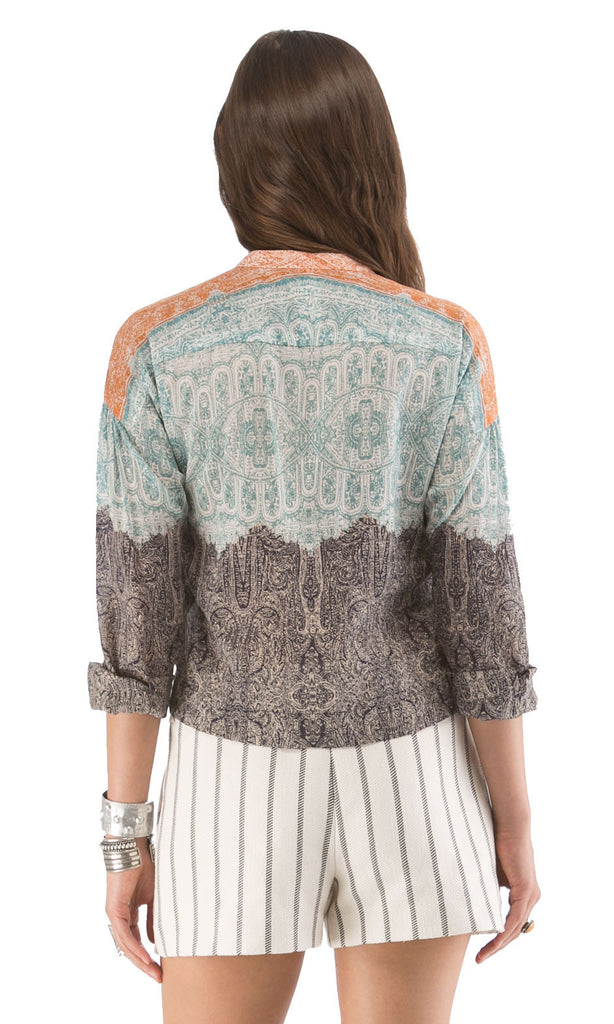 Our lightweight Cropped Blouse cut from our colorful vintage paisley print features a plunging v neckline and sleeves that can be rolled up or left down. Pair with our Pleated Stripe Shorts for a fun warm weather look.